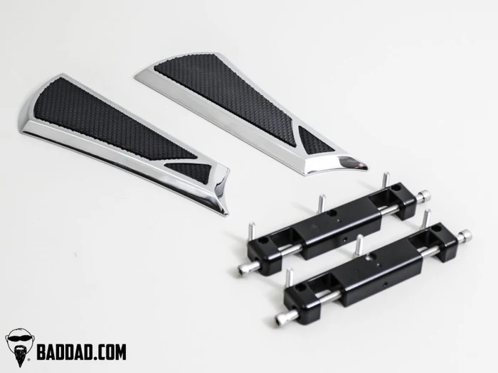 Bad Dad’s Street Series Rear Boards are CNC machined from 6061 aircraft grade billet aluminum and are available in gloss black powdercoat & chrome. Bad Dad’s floorboards are finished with a high-quality custom cut rubber insert for a great look and comfortable ride.