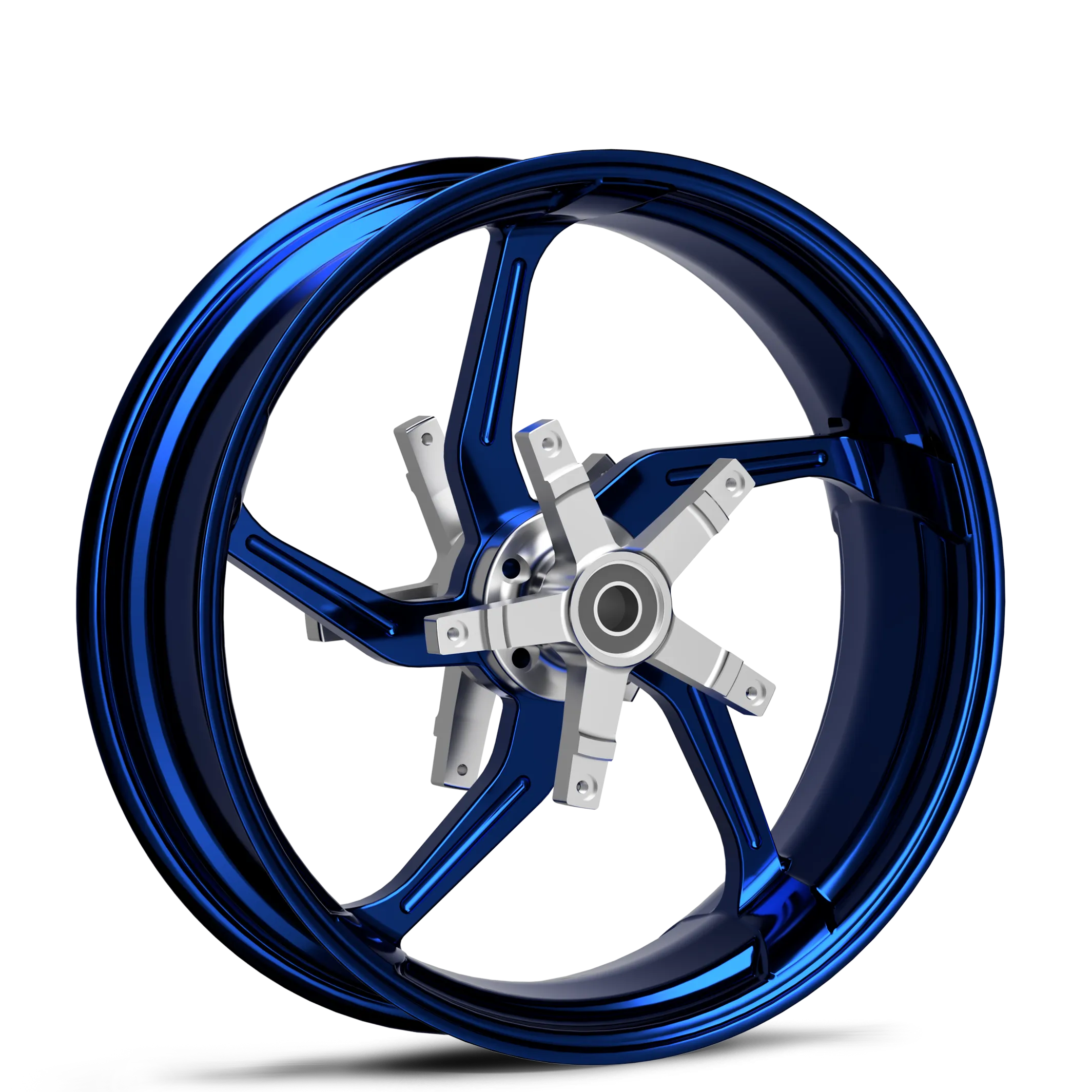 T6 6061 aluminum wheel blank is first sent to be CNC machined into the Aggressor design. Then it’s passed along to be polished to perfection. Finally, it’s powder-coated with a smooth blue finish.