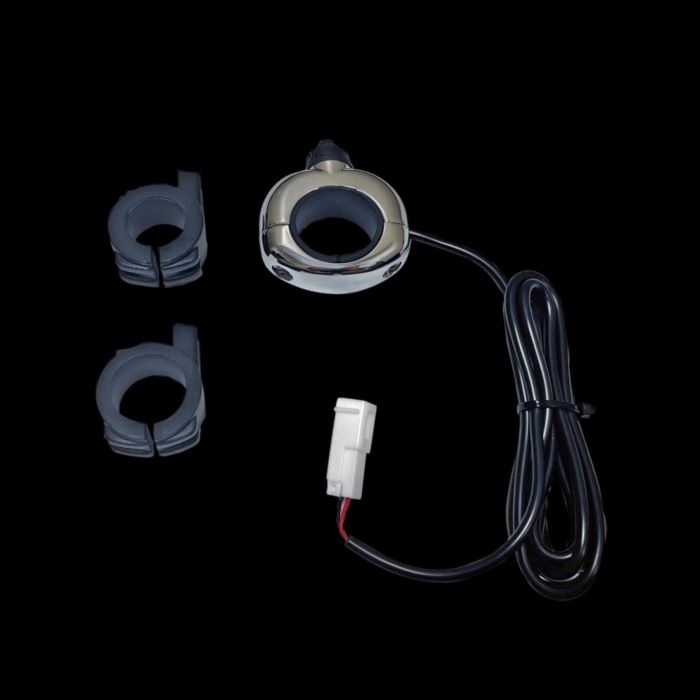 Universal handlebar switch provides access for powering auxiliary driving lights or accessory lighting on and off. Rubber switch is built into chrome or gloss black clamp. Three rubber insulators are supplied for multi-fit use on 7/8”, 1”, or 1-1/4” handlebars with mounting hardware included.