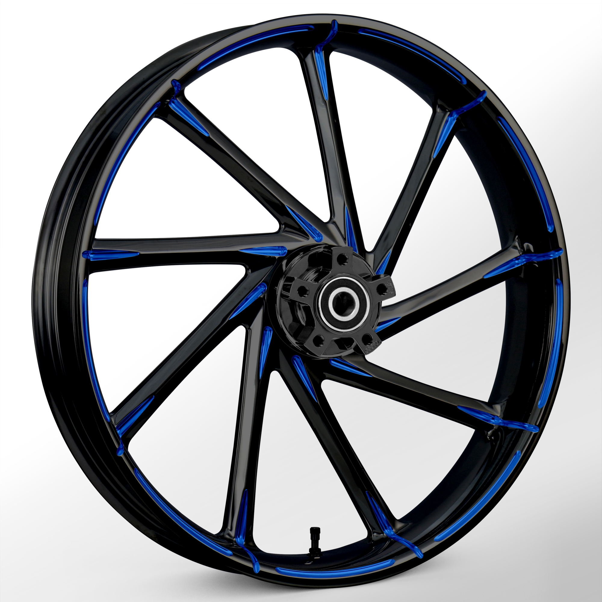 This Kinetic Dyeline Touch Of Color Blue 21 x 3.25 Wheel is an American made Forged wheel that is designed to give you the best ride possible! Made in California it starts with machining that’s twice as time-consuming as the standard motorcycle wheel for more depth and more detail! We all know the little details matter! It is then polished and sent to Chrome or Black anodize to give it that perfect shine!