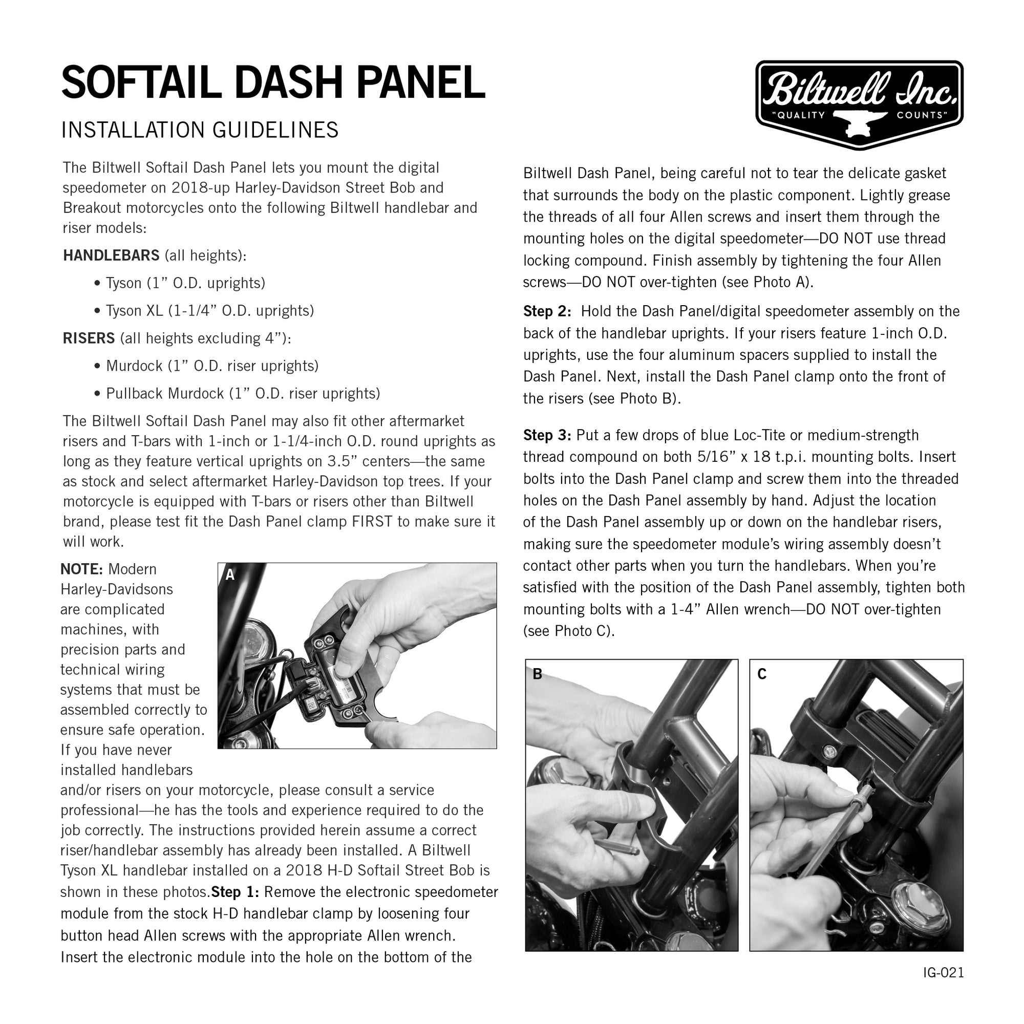 We dug Harley’s digital dash module when we saw on our 2018 Softail Street Bob, but we knew it would pose challenges for Softail riders who wanted to customize their new M8-powered Harley with Tyson XL bars or Murdock risers. Our Billet Dash Panel accepts the stock digital module and OE hardware and bolts around the uprights on our Tyson XL bars or Murdock risers with the supplied 1-inch alloy shims to create the cleanest digital dash install available.