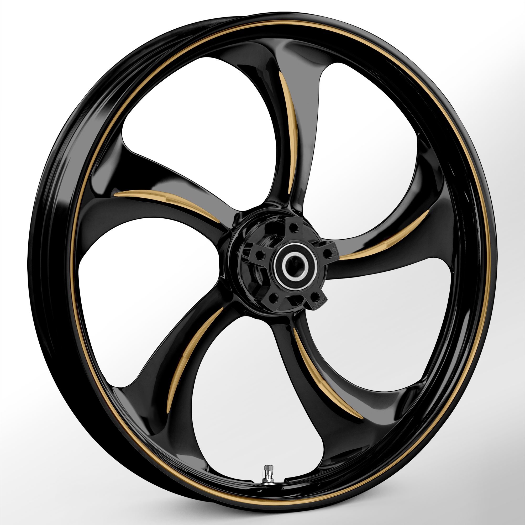 This Rollin Dyeline Touch Of Color Gold 18 x 13 Wheel is an American made Forged wheel that is designed to give you the best ride possible! Made in California it starts with machining that’s twice as time-consuming as the standard motorcycle wheel for more depth and more detail! We all know the little details matter! It is then polished and sent to Chrome or Black anodize to give it that perfect shine!