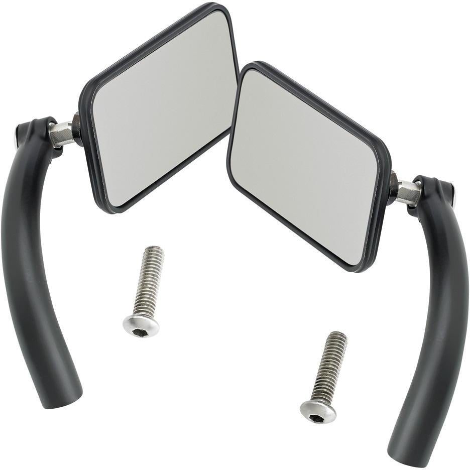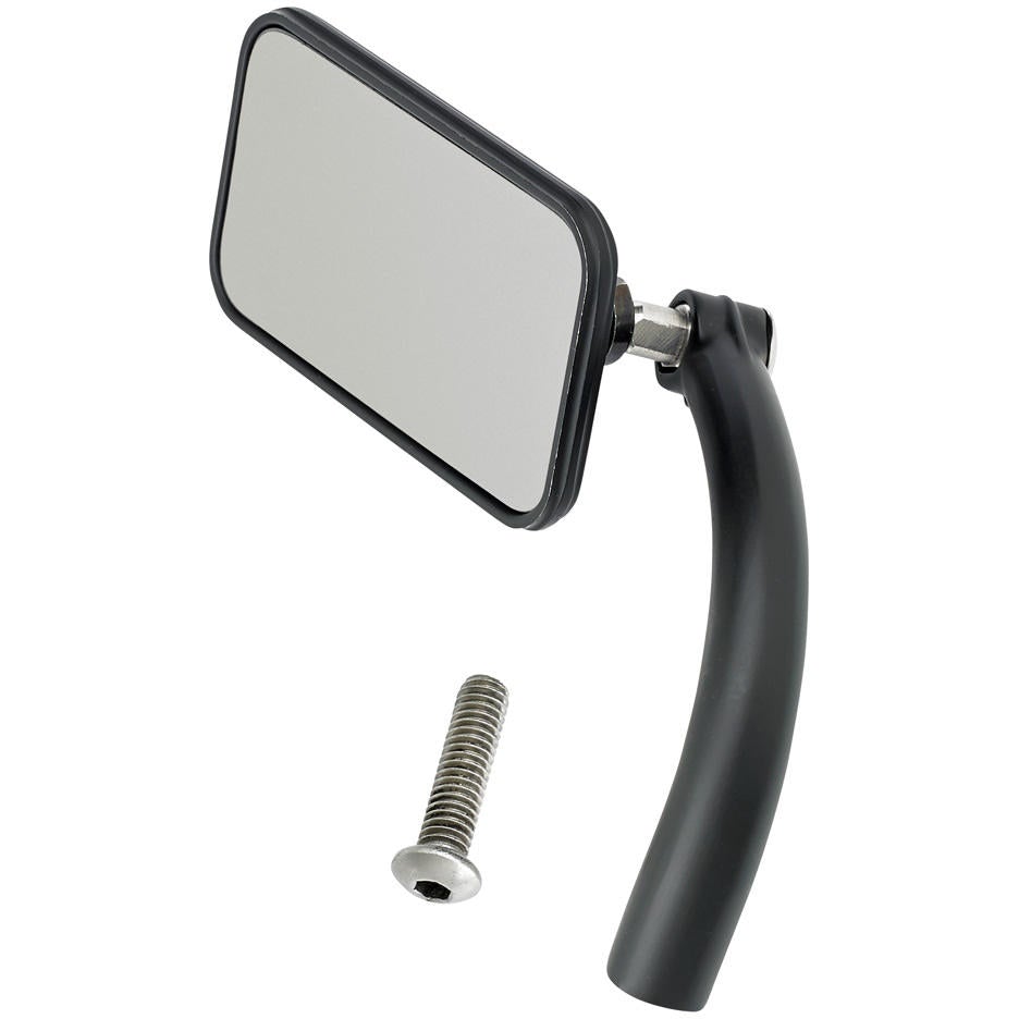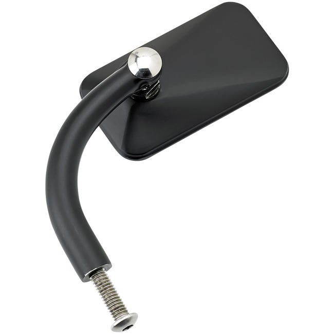 Precision die-cast aluminum construction with stainless-steel ball joint mounting hardware. Tempered glass mirror head. Clever ball joint assembly inside the mirror perch can be reversed for right-side mounting. Built to bolt-onto most stock Harley-Davidson hand controls.